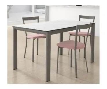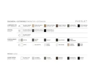 Mesa Puzzle extensible de cocina de diseño moderno y líneas sencillas. Puzzle se ofrece hasta en once medidas diferentes, lo que le convierte en un modelo que se adapta a cualquier espacio de cocina. Se extiende mediante el desplazamiento de las patas, que incorporan ruedas no visibles para una cómoda apertura, y el extensible, de una sola pieza y del mismo material y acabado que la encimera, se abre con un suave mecanismo de giro. La encimera se ofrece en laminado, cristal y porcelánico. Las patas con una original sección rectangular son de acero lacado epoxi.
