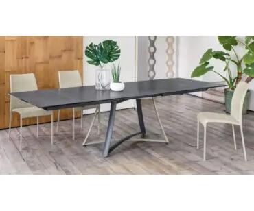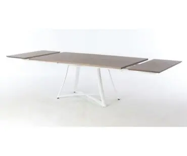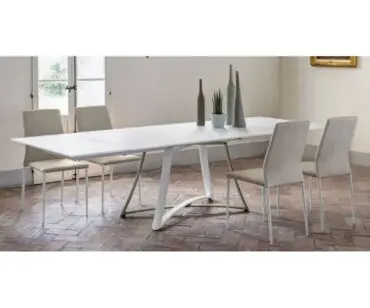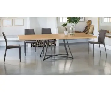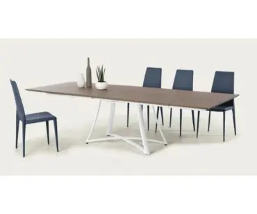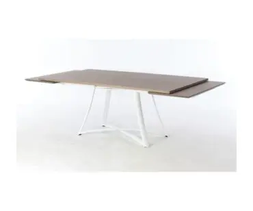 Mesa Big Bang Ingenia-Bontempi, una mesa de un diseño y un acabado inconfundible para una gran firma. Se fabrica con sobre enchapado en canto de Madera maciza, vidrio brillo, vidrio antirrayaduras mate aterciopelado o Superceramic. Mesa que puede ser fija o extensible.