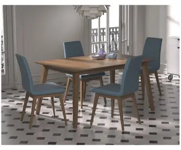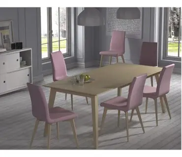 Mesa comedor de inspiración nórdica. La mesa está realizada con estructura de haya, con tapa en haya o roble, pudiendo elegir el barniz. La mesa la podemos comprar sola o con cuatro o seis sillas del fabricante, de las cuáles, hay un gran número de modelos a elegir, para encontrar fácilmente la que más se adapte a nuestras necesidades. Con tapizado y barniz del muestrario a elegir.