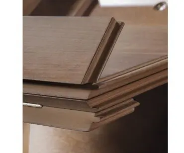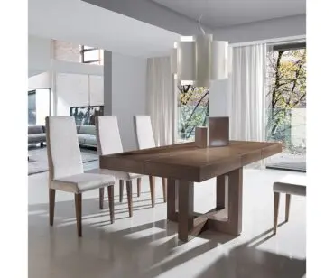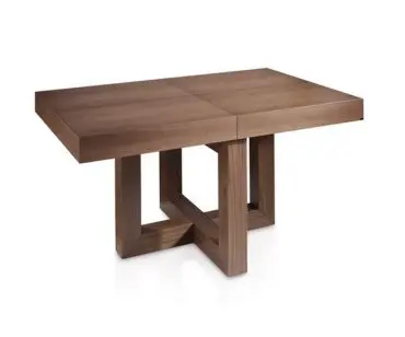 Espectacular mesa de comedor extensible con pata central. Se oferta en mukaly, roble o nogal, todos ello en un amplio abanico de barnices y lacas. Extensión por tapa. Disponible en diferentes medidas.