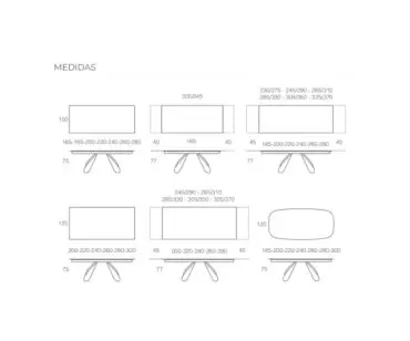 Las medidas de mesa extensible son las mismas que la mesa fija rectangular, pero con dos extensibles de 40cm o 45cm por cada lado según la medida de la mesa.