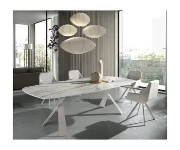 Mesa de comedor extensible Kreta, de Ramiro Tarazona. Mesa de comedor extensible en varios acabados de tapa cristal optico o natural brillo o mate y también en madera, cerámico o dekton. Original y elegante diseño disponible en distintas medidas y gran variedad de acabados para sus patas de acero lacadas en diferentes colores.