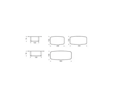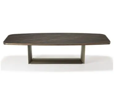 Mesa con base en acero barnizado gofrado titanio, graphite o negro. Sobre en cerámica Marmi colores Calacatta, Alabastro, Ardesia, Golden Calacatta mate, Golden Calacatta brillo, Portoro mate, Portoro brillo, Sahara Noir brillo, Emperador o Makalu y perfil inferior redondeado barnizado negro o Brushed Bronze. Grosor sobre de 6 cm en la medida 300×128 cm y de 5 cm en las medidas 200×120 cm y 240×120 cm.