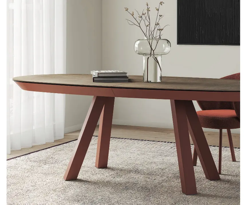 Mesa Esla de Mobliberica, mesa extensible con patas de acero pintado en epoxi. Tapa de Ø125 (165×125), Ø140 (185×140) o bien Ø150 (200×150) en porcelánicode muy alta durabilidad, impermeable, antiarañazos y resistente al choque térmico (podemos poner una olla recién salida del fuego sobre la tapa). Hay varios acabados a elegir de las patas y la tapa. Apertura con desplazamiento de patas con ruedas de goma para facilitar la apertura, evitando el ruido y el rayado. De líneas puras y desbordante belleza, esta mesa nos recuerda el fresco aroma salino del Mediterráneo. Sorprendentemente se extiende hasta los dos metros sin perder un ápice de su elegancia, a la vez que adquiere una estabilidad desconocida en una mesa redonda de estas dimensiones.