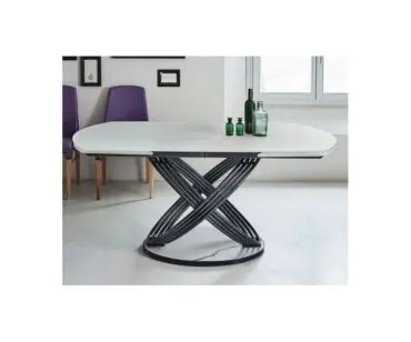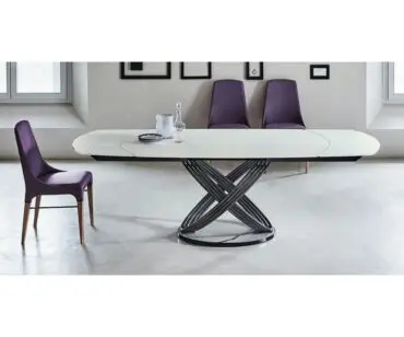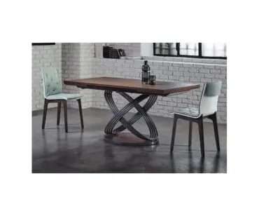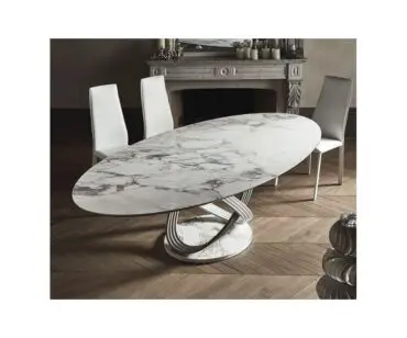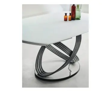 Mesa Fusión modelo 52.03 de Bontempi, fijación de mesa con aros de metal lacado, su base se puede hacer en metal lacado, madera chapada o Supermarble. Su tapa con diferentes posibilidades para que elijas la que más se adapta a ti, madera, vidrio, terciopelo mate-vidrio anti rayaduras, mármol natural o SuperMarble.