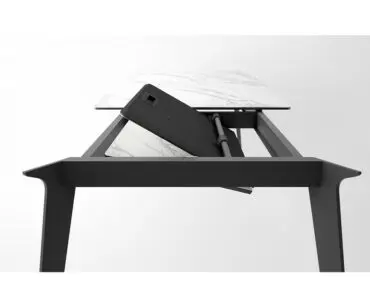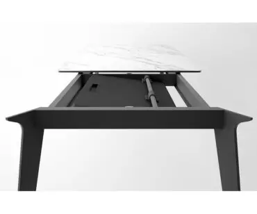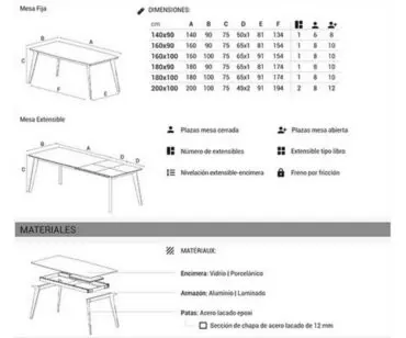 El armazón es de aluminio lacado epoxy y las patas de acero, también pintado en polvo de acabado texturado. Se fabrica hasta en seis medidas, y puede ser fija o extensible, las mas pequeñas (120×80, 140×90, 160×90 y 160×100) son ideales para los amueblamientos de espacios abiertos entre la cocina y el salón, y las más grandes (180×90, 180×100 y 200×100), son válidas para cualquier comedor grande, pues son ampliables hasta 245 cm las de 180 cm de largo y a 290 cm la de 200×100.