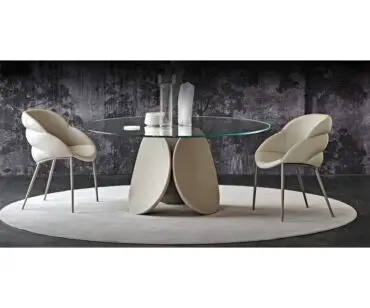 El diseño de mesa escultural Maxim surge de la relación indivisible entre su forma, constituida por tres pétalos y el material con el cual está realizada. El acabado de la base de esta mesa, en efecto, se realiza utilizando arcilla, con colores tierra y naturales. Maxim se realiza en dos versiones: una mesa redonda con sobre de vidrio transparente que permite apreciar la base escultural en su totalidad, y el modelo Maxim Argile completamente espatulado en arcilla, lo cual le brinda un aspecto aún más orgánico. Gracias a este resistente acabado, Maxim resulta ideal también como mesa para exteriores de diseño.