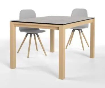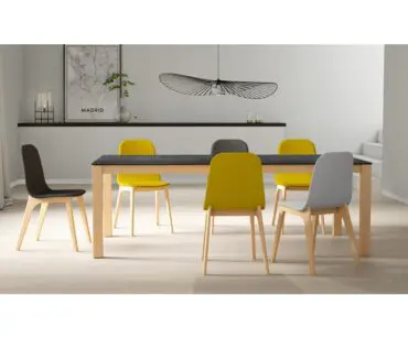 Mesa Quadra Nova Cancio. Mesa ambivalente para cocina y salón de líneas depuradas y diseño minimalista. Dispone de hasta seis medidas diferentes, las más pequeñas ideales para una distribución de cocina de tamaño medio (110×70 y 120×80), las medianas pensadas para espacios abiertos entre cocina y comedor (140×90 y 160×90 ó 160×100) y las de mayor dimensión para cualquier amueblamiento de salón (180×90 ó 180×100).Posibilidad de elegir que sea fija o extensible. El sistema de extensión de la mesa Quadra nova funciona mediante el desplazamiento de las patas por una guía de aluminio de alta resistencia y las alas se abren con un mecanismo de tipo libro. Las tres medidas inferiores ofrecen un ala de gran dimensión (55 o 60 centímetros) y las tres más grandes hasta dos extensibles de 43 y 50 centímetros, y siempre a juego con la encimera principal. La mesa Quadra nova incorpora unas patas de madera maciza de haya, terminada en cuatro acabados de madera teñida o tres lacados, y la encimera se ofrece en porcelánico con base en cristal, vidrio templado coloreado sobre tablero contrachapado, fénix (material nanotecnológico ultramate y antihuella) y laminado de alta presión. Quadra nova, la mesa ideal para los espacios más modernos y exigentes.
