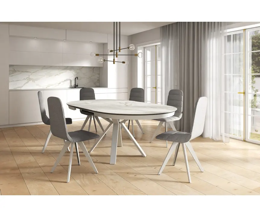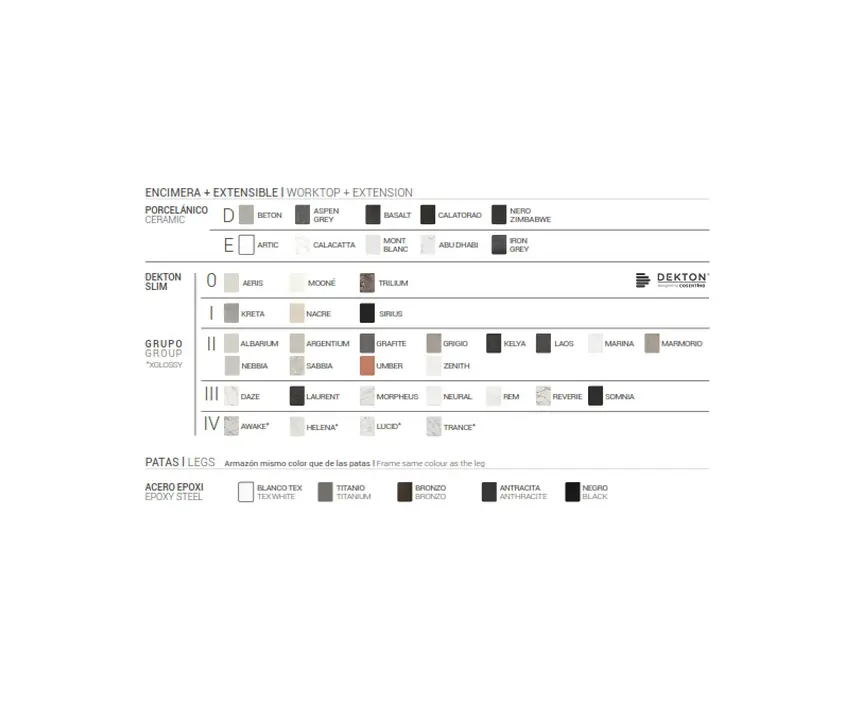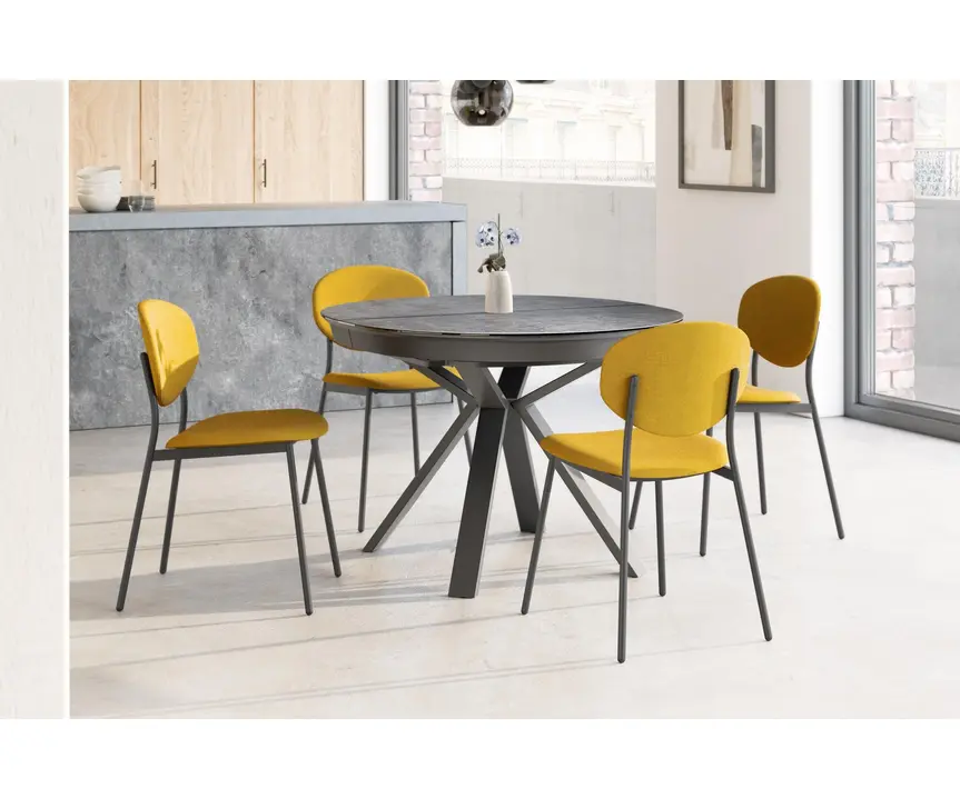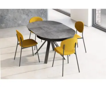 Mesa extensible ovalada para salón o cocina con un diseño moderno. La forma de sus patas, fabricadas en acero con recubrimiento epoxi, le confiere un estilo elegante y estilizado con una estética moderna. El modelo Sfera Harmony ofrece la solución ideal para comedores que necesitan ampliar su superficie disponible. Su forma ovalada permite aprovechar al máximo el espacio. La mesa se abre mediante un movimiento sincronizado del tablero y la extensión de 50 centímetros, fabricada con el mismo material y acabado que el tablero principal, y se abre gracias a un mecanismo de mariposa. La continuidad del diseño entre las dos partes del tablero principal está garantizada por Dekton, disponible en todos los acabados de la colección Dekton Slim.