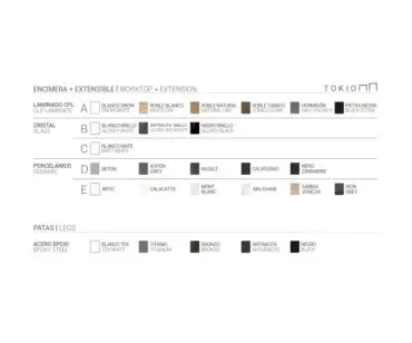 La mesa Tokio, puede ser extensible o fija, y es perfecta para un ambiente de cocina o comedor. Con líneas de diseño minimalista y moderno, está fabricada con patas de acero lacado epoxi y encimera en cristal, porcelánico o laminado. Su apertura se realiza mediante el desplazamiento de las patas, que llevan integradas con ruedas para facilitar su movimiento. Los extensibles, de tipo libro,y de gran tamaño, incorporan un tirador para facilitar su apertura y siempre son del mismo material y acabado que la encimera principal.