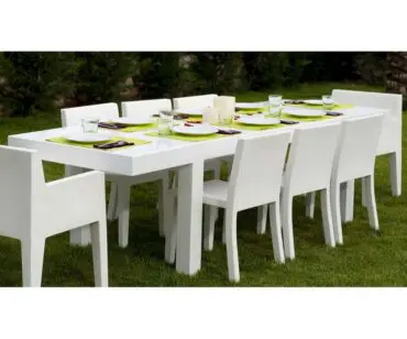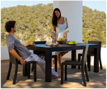 Mesa Jut Vondom, diseño Studio Vondom. Fabricada con resina de polietileno mediante moldeo rotacional con doble pared 100% Reciclable. Apto para exterior e interior. Disponible en varios acabados.La colección JUT se compone de diferentes piezas tanto para proyectos de exterior como para interiores modernos y vanguardistas: tumbona, sofá, sillón, silla, butaca, dos mesas de distintas medidas, mesa extensible, taburetes y mesa alta. Con la colección JUT, se impone una nueva estética en cuanto a mobiliario de resina de polietileno fabricado mediante moldeo rotacional. Sus formas angulosas, muy difíciles de conseguir con este proceso de fabricación, son una propuesta única hasta ahora. VONDOM ofrece estas piezas en diversos colores, tonos muy vivos que aportan un toque aun más original a los muebles. La ergonomía, la funcionalidad y la ecología de los muebles JUT son otras de las características primordiales en los diseños VONDOM. Los orificios de evacuación para el agua, y los contrafuertes aseguran la máxima comodidad al estirarse o sentarse. El material innovador y reciclable es el de mayor exigencia del mercado para garantizar un uso prolongado, soportando las más extremas condiciones meteorológicas y conservando los colores durante su vida útil. Todos estos conceptos los convierten en la mejor solución de muebles tanto en interiores como en exteriores. La colección JUT, única en su género, se elabora con moldes especiales diseñados por VONDOM y fabricados mediante un proceso tecnológico con el que se consiguen piezas exclusivas.