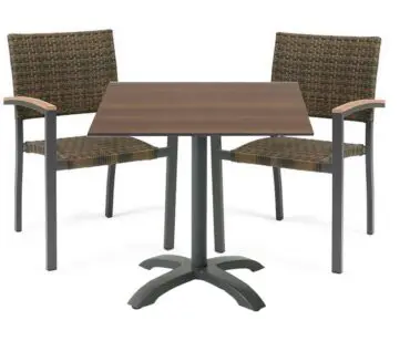 La base siempre es la misma, y hay disponibles tres medidas de tapas 60×60 cm 70×70 cm. y 80×80 cm. Todos los tableros son de compacto válidos para uso en exterior y son de la marca Formica, tienen el canto negro y son de 1 cm de grueso.