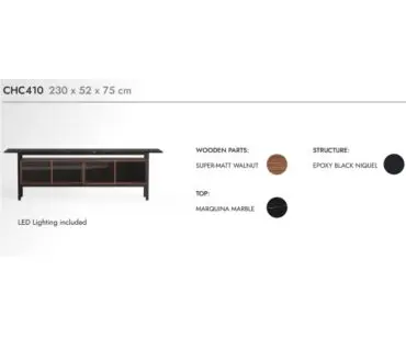 La versión que ponemos en venta y entrega rápida 15-20 días es con tapa en marmol marquina, caja en madera de nogal síper mate y patas en niquel epoxi color negro, con luz led interior.
