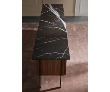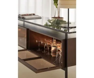 Con su apariencia ligera y flotante, el aparador casi parece una pieza de arquitectura moderna en sí misma. La construcción de acero sólido elevado brinda estabilidad, mientras que el cuerpo de madera agrega la impresión espacial. El tablero de la mesa que funciona como un techo flotante con sus aleros extendidos completa el marco minimalista que combina tres materiales naturales simples, madera, acero y piedra.