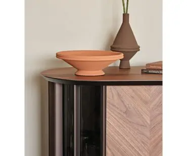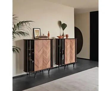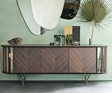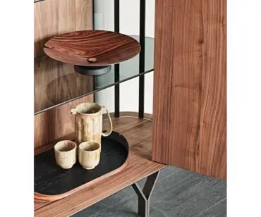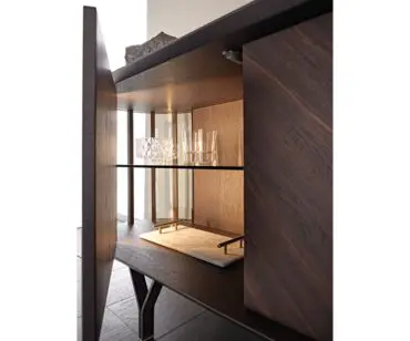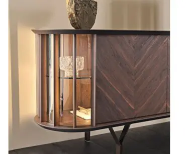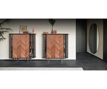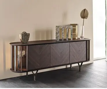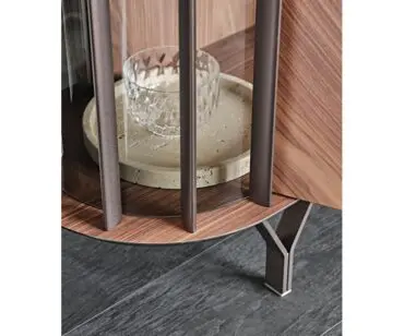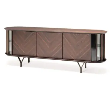 Las puertas de madera se realizan con listones diagonales que destacan las espectaculares vetas naturales de la madera. Este aparador moderno se realiza con 2 o 4 puertas, de manera que se adapte naturalmente a cualquier espacio de la casa. Completa la familia la versión Costes TV, más baja y con los lados curvos abiertos. El estilo es elegante, pero equilibrado, fruto del cuidado minucioso de los detalles que distingue la manufactura italiana. Los estantes internos de cristal fumè tienen la finalidad de proteger y destacar los objetos más preciados guardados en el interior de este seductor aparador de diseño.