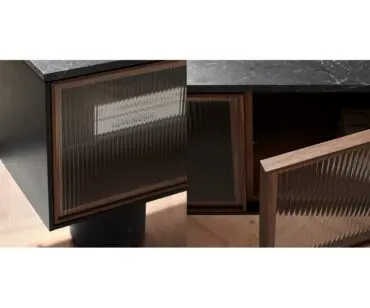 Los aparadores Rio tienen en común que están todos colocados sobre cilindros de mármol macizo lo que brindan estabilidad y grandeza en contraste con los gabinetes precisos y finamente elaborados en la parte superior. Los marcos delgados de madera y las puertas de empuje para abrir con diferentes incrustaciones como la madera estructurada son una especie de puente entre los dos pedestales. El diálogo entre todos los componentes crea un carácter sofisticado.