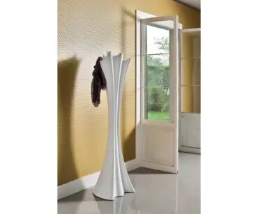 Perchero en polietileno blanco, con lastre de contrapeso en hormigón vibrado. Adecuado solo para uso interior.