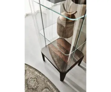 Vitrina en cristal extraclaro transparente con cielo y fondo en nogal Canaletto o roble ahumado. Estantes en cristal extraclaro transparente. Iluminación led. Capacidad máxima: cada estante kg 6.