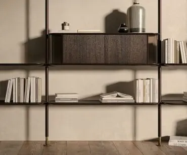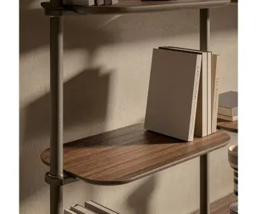 Estantería componible con montaje a pared o a techo. Montantes y soportes en acero barnizado gofrado titanio o bronce. Estantes y contenedores en madera nogal Canaletto (NC) con fondo barnizado gofrado titanio o roble ahumado con fondo barnizado gofrado bronce y vidrio bronce.