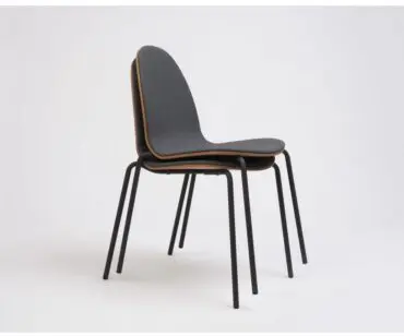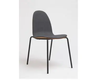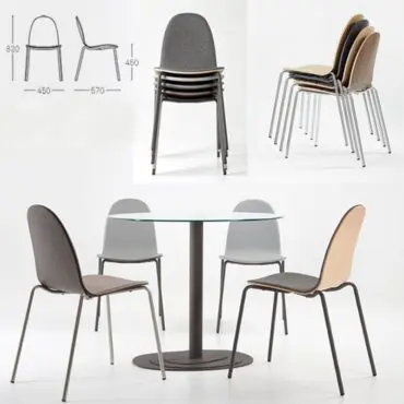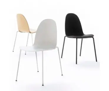 Estructura de acero disponible en varios colores. Carcasa en haya tintada, lacada o tapizada. Opción de carcasa combinada tapizada y madera. Apilable.