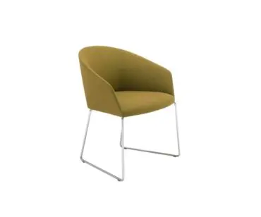 Silla Brandy de Andreu World, diseñada por Lievore Altherr Molina. Elegancia y comodidad son algunas de las características de esta colección de sillas gracias a su estructura envolvente. Sillón con asiento y respaldo tapizado y base de patín de acero en acabado cromo brillo, blanco o negro.