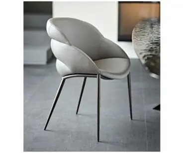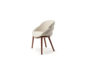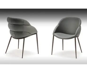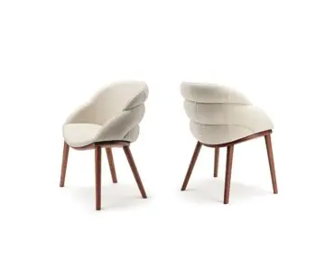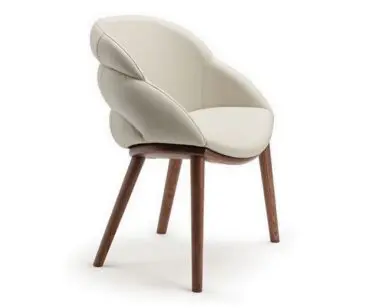 Silla Camila de Cattelan, diseño que envuelve el cuerpo, con líneas curvas. Camila dará a tú comedor un ambiente acogedor, que permita sentirse desde el primer momento como en casa. Una silla con apoyabrazos acolchada, las costuras horizontales en la parte trasera del respaldo generan 3 salientes acolchadas que terminan en el apoyabrazos con uniformidad. En el área inferior de la parte trasera del respaldo, la estructura profunda y el acoplamiento de las patas destacan aún más la suavidad de las curvas envolventes. Camila se fabrica en dos variantes: con patas de refinada madera, y Camila ML con patas de metal, más liviana y fácil de manipular. Ambas variantes encuentran el perfecto equilibrio entre el voluminoso asiento y las agraciadas patas.