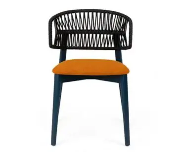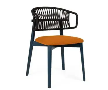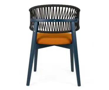 Silla comedor Coffe Cord, una silla o sillón según se quiera usar, puesto que su respaldo ancho, permite poder apoyar los brazos. Llama la atención la originalidad de la cuerda trenzada a mano en el respaldo siempre en color negro, la estructura es madera de haya que permite una amplia variedad de acabados de color.