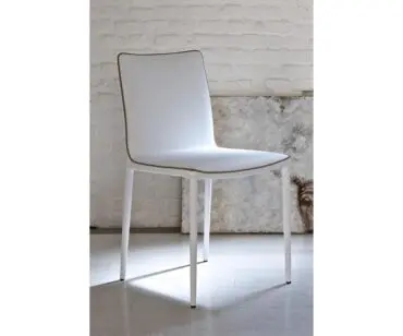 Esta silla se caracteriza por el cordón que siempre rodea todo el perímetro, pero podemos elegir si lo deseamos del mismo color que el resto de la silla o si deseamos un color en contraste con el tapizado. Por ejemplo , si elegimos el acabado cordón en contraste y escogemos la ecopiel blanca TR500, el cordón, en contraste, es en color arena.