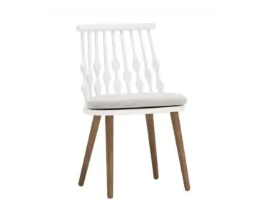 Silla Nub Andreu World, diseñada por Patricia Urquiola. Está compuesta por una atractiva línea de sillones, taburetes y butacas con estructura de madera natural que ofrecen múltiples combinaciones de color en su estructura y tapizados. Nub es el resultado de un trabajo sofisticado de ebanistería, actualizado con mucha delicadeza y de una forma contemporánea. El elemento esencial en el proyecto no son tanto las varillas cilíndricas, sino ese simpático engordamiento de las varillas en el respaldo a la altura de la zona lumbar. Es este ritmo alternado el que hace reconocible el proyecto ofreciéndole una materialidad y tridimensionalidad a la silla. Disponible en un amplio abanico de telas y barnices o lacas. Colección compuesta por sillones y butacas, bien con base patín, 4 patas en madera maciza de haya, en acero o bien con base giratoria de acero.