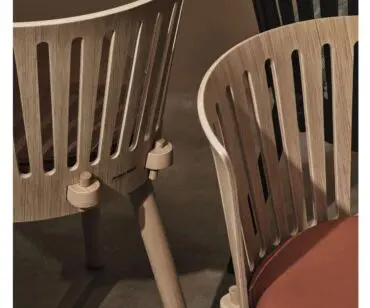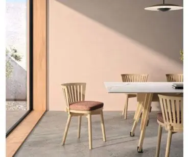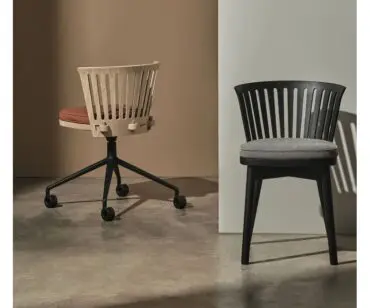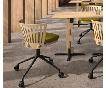 Olena Chair soluciona la silla “bistrot” de cantina, para comedores de empresas y también ofrece una estética fresca, original y responsable con el entorno para espacios de trabajo en su versión de base de ruedas.
