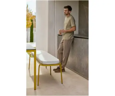 Banco con y sin respaldo fabricado completamente en acero inoxidable. Se ofrece la opción de asiento y/o respaldo tapizados. Los anchos disponibles son 140, 160, 180 y 200 cm. Abril se presenta como una exquisita colección de bancos de exterior que, al igual que el mes que le da nombre, evoca aromas primaverales y placenteras sobremesas al sol.