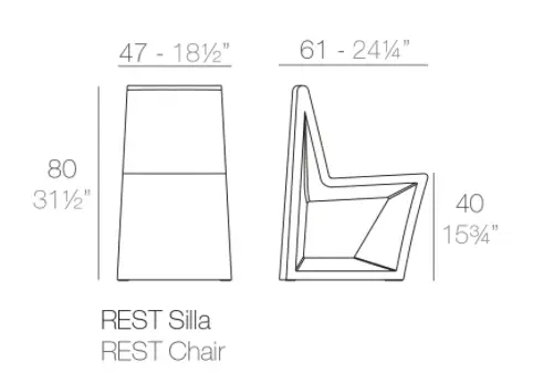 Silla Rest Vondom, diseño de A-cero. Fabricada con resina de polietileno mediante moldeo rotacional con doble pared. 100% Reciclable. Apto para exterior e interior. Disponible en varios acabados. Una colección inspirada en el ORIGAMI, arte de origen japonés basado en el plegado del papel para obtener figuras de formas variadas, y en la línea del pensamiento “Less is more”. Se trata de un conjunto formado por un sillón, un sofá y una mesa, cuyas estructuras modulares dan libertad para que el cliente pueda amoldarlas a sus necesidades y adaptarlos a cualquier espacio. La técnica de fabricación utilizada es el moldeo rotacional. Se trata de un proceso tecnológico que garantiza la máxima calidad del producto y cuida todos los detalles. REST nos muestra la esencia de sus creadores siempre fieles a la elegancia, la belleza y la exclusividad, así como su total adaptación a los clientes. A partir de unas formas geométricas marcadas, dinámicas, elegantes y ligeras, nace una colección que proporciona el máximo confort al usuario y se integra en la arquitectura de vanguardia gracias a su diseño contemporáneo como la que nace del estudio A-cero.