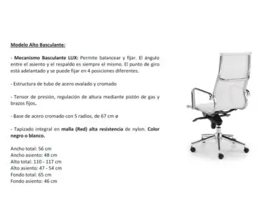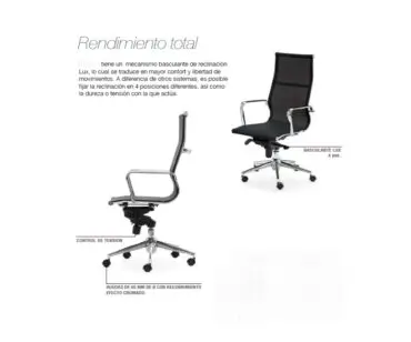 Mecanismo Basculante LUX: Permite balancear y fijar. El ángulo entre el asiento y el respaldo es siempre el mismo. El punto de giro está adelantado y se puede fijar en 4 posiciones diferentes