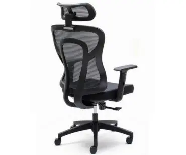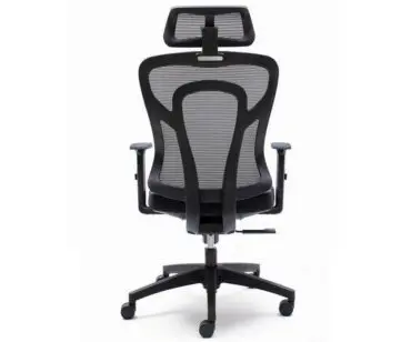 Respaldo de malla de alta densidad cuya curvatura actua como soporte lumbar, con marco perimetral de polipropileno en negro.