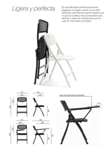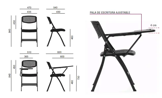 La versión con pala está disponible solo en color negro, la silla se entrega montada y siempre se vende en cajas de 4 unidades.