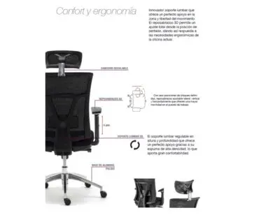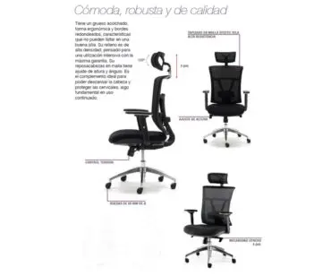 Completa silla de oficina con una estupenda relación calidad precio, Esta silla cuenta con sistema sincro con regulación de tensión, brazos 3D regulables en altura, ancho y profundidad, cabezal y apoyo lumbar lumbar y base acero cromo brillo.