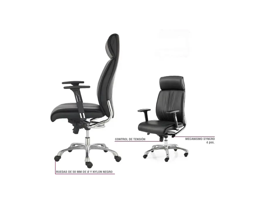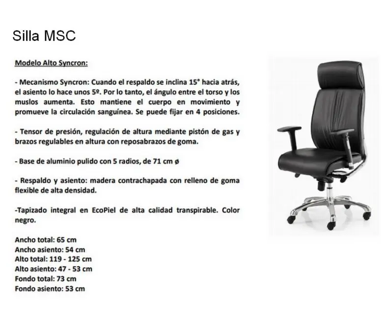 Mecanismo Syncron: Cuando el respaldo se inclina 15° hacia atrás, el asiento lo hace unos 5º. Por lo tanto, el ángulo entre el torso y los muslos aumenta. Esto mantiene el cuerpo en movimiento y promueve la circulación sanguínea. Se puede fijar en 4 posiciones.