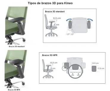 Brazos :Existen dos opciones de brazos, 3D-K regulables enprofundidad, altura y giro; y 3D NPR, regulables en altura, anchura y profundidad. Están integrados en el respaldo. – Brazos 3D-K: Con estructura de poliamida y reposabrazos de poliuretano. Fácil regulación en 3D (tres movimientos): 8 posiciones en altura (6,5 cm), 5 posiciones en profundidad (4 cm ) y 3 posiciones para cada lado en giro (17º). – Brazos 3D NPR: Con estructura de poliamida y reposabrazos de poliuretano de dimensiones generosas. Fácil regulación en 3D (tres movimientos): 12 posiciones en altura (10,5 cm), 6 posiciones en profundidad (5cm) y 11 posiciones en ancho (8 cm) Gracias a las dimensiones del reposabrazos es capaz de abarcar, con sus tres movimientos, todo el rango de regulación de un brazo 4D (altura, profundidad, ancho y giro). Estos brazos se adaptan perfectamente a las diferentes tallas de usuarios, pues permiten en uso acercar la silla