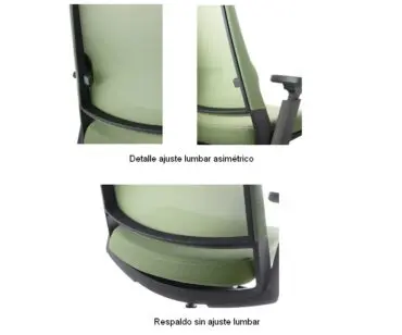 Regulación lumbar asimétrica. Formado por piezas independientes de polipropileno ajustables verticalmente y con posibilidad de regulación asimétrica garantizando un contacto permanente en la zona lumbar. Las piezas generan una tensión en la malla, la cual es el principio de funcionamiento del sistema. El color de estas piezas es de color negro a juego con el marco del respaldo..