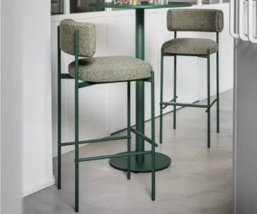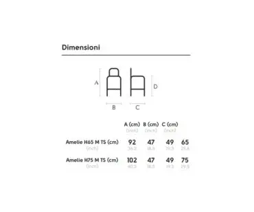 El taburete Amelie está elaborado con una base metálica de cuatro patas. Asiento y respaldo acolchados y tapizados en piel, polipiel o tejido.