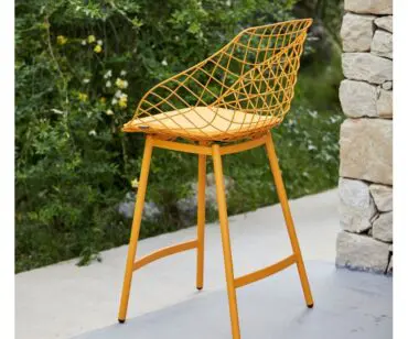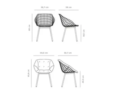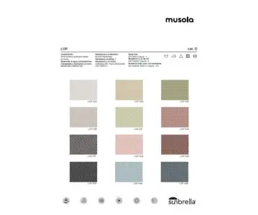 Sillón Canasta de Musola diseñado por Yoho staudio, fabricado por completo en acero inoxidable disponible en una amplia gama de colores. Hay disponible dos opciones de tapizado, bien solo el asiento o mediante una funda extraíble y desenfundable, con el interior de fibra de poliéster y de espuma de poliuretano hidrófuga (Dry Feel), recorre todo el perímetro, pero mostrando la parte trasera de la minuciosa retícula que caracteriza su estructura.