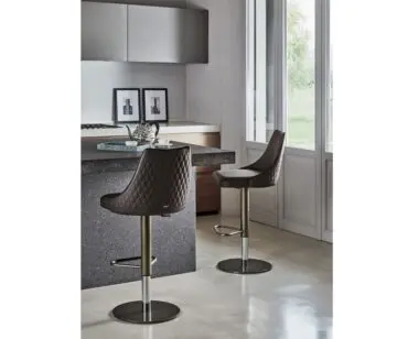 Taburete Clara de Bontempi, base de acero giratoria y regulable en altura disponible en una amplia gama de acabados, como por ejemplo, cromo brillo, negro, blanco, arena, antracita, marrón oscuro, incluso como novedad latón envejecido o negro brillo.