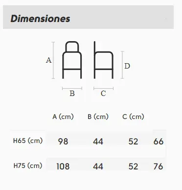 El taburete está disponible en dos alturas de asiento, 66 o 76 cm La altura de 66 cm. está diseñada para usar en encimeras de una altura total entre 90-96 cm, lo habitual de cocina.