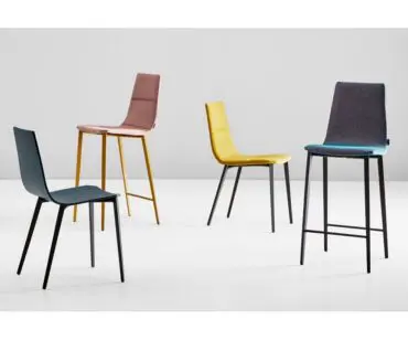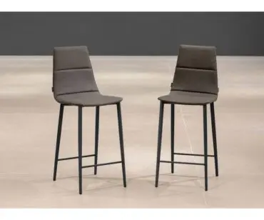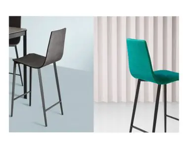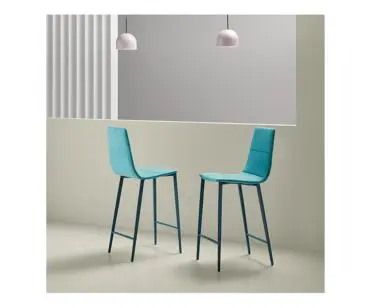 Taburete Salt de Mobliberica, realizado en estructura de acero con posibilidad de una amplia carta de colores y carcasa de madera tapizada en una gran variedad de tejidos, gran parte de ellos diseñados con telas vinílicas de fácil limpieza, tambien hay tapicerías con tecnología antimanchas Aqua-Clean para cocina. Hay dos opciones de hacer el tapizado liso o con rayas horizontales.