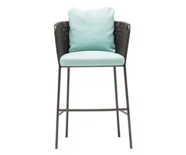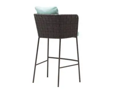Banqueta Nuez BQ 0290, banqueta baja con asiento tapizado, respaldo cinchado y estructura de aluminio. Disponibles en diferentes acabados.