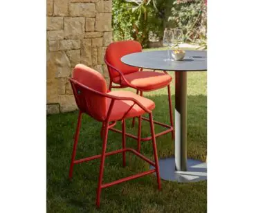 Taburete Nansa de Musola diseñada por Santiago Sevillano, fabricada completamente en aluminio, disponible en una amplia gama de colores. Su asiento es extraíble y desenfundable, con el interior de espuma de poliuretano hidrófuga (Dry Feel) y fibra de poliéster.