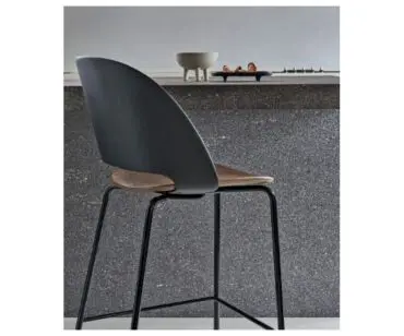 Taburete Polo 34.69 bajo, con estructura en metal y diferentes acabados de color, respaldo en polipropileno en una gran variedad también de colores y asiento con dos opciones en madera maciza o tapizado en Eco Leather, terciopelo técnico, tejido Mambo y Lulú, Nabuk impermeable, etc.