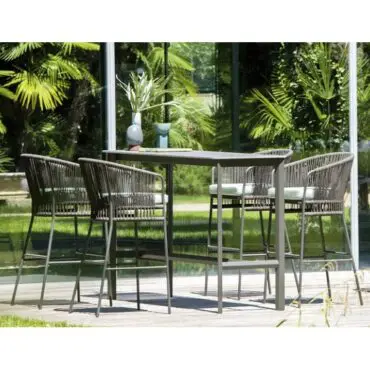 Es un taburete perfecto para combinaciones de mesas de bar, elegido por diseñadores y arquitectos para decorar terrazas y espacios al aire libre, creando una zona moderna y dinámica.