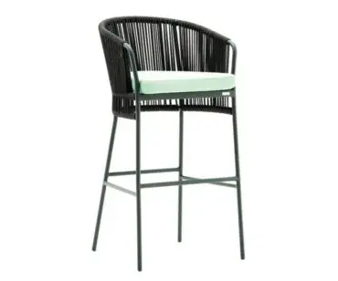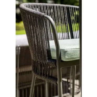 Taburete Tibidabo esbelto y elegante, con estructura de aluminio adornada con un aireado tejido artesanal. El respaldo alto y envolvente hace que este asiento sea extremadamente cómodo para todas las ocasiones.