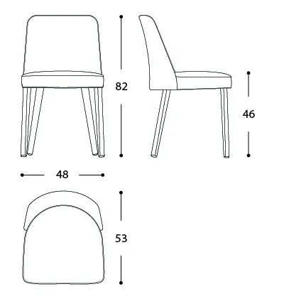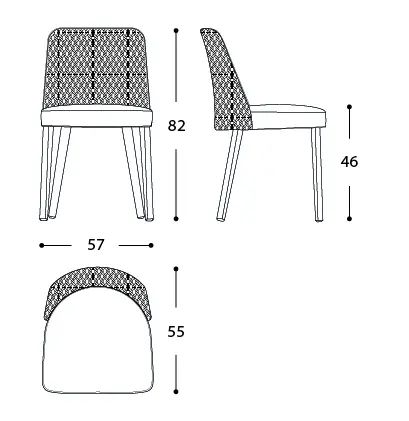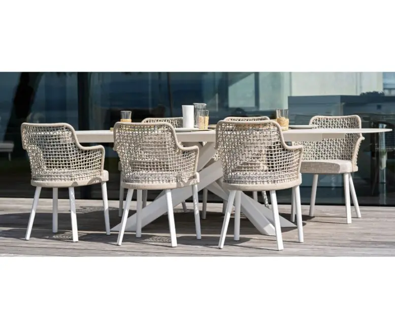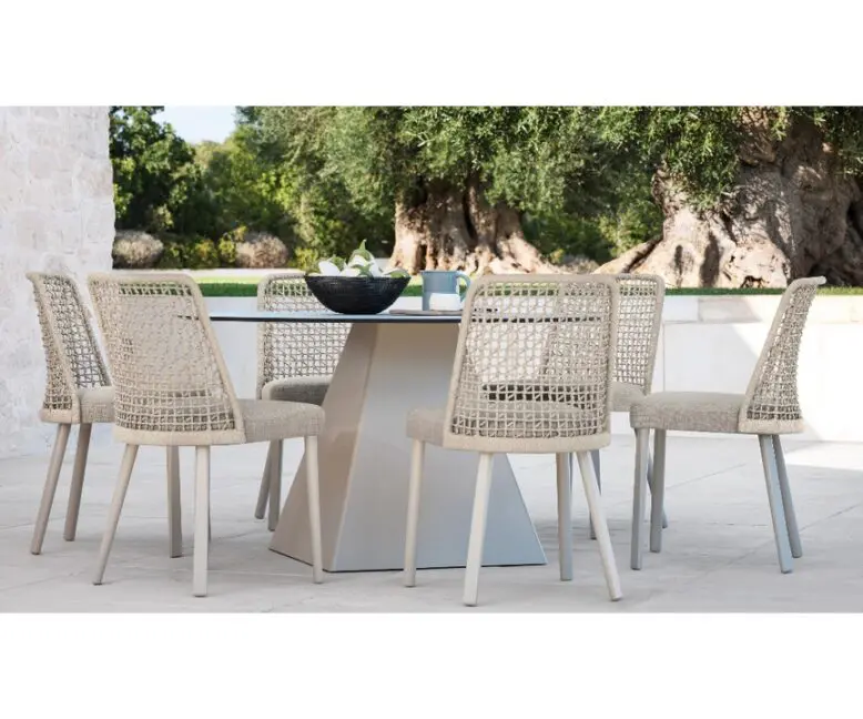 Asiento de material plástico moldeado por inyección, tapicería del asiento de tela o textura con molde en propileno. Respaldos con marcos de aluminio recubiertos de polvo revestidos de textura, tela o trenzados. Patas de aluminio o madera maciza de iroko.
